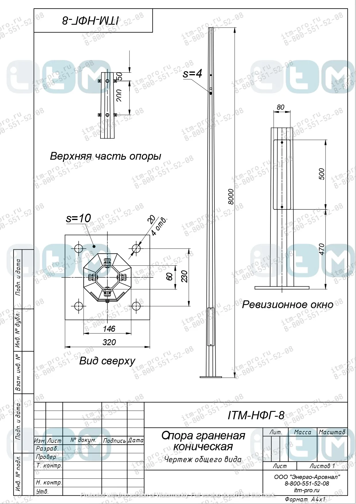 Граненая опора НФГ-8,0-05-ц относится к несиловому типу опор освещения - подвод питающего кабеля возможен только под землей, для обслуживания подключения в опоре  предусмотрен специальный лючок, расположенный в нижней части.