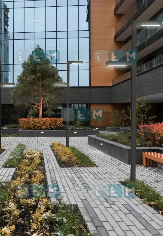 Г-образная парковая опора ЭСКАДА отличается удлиненной верхней частью, в которой расположены светильники.